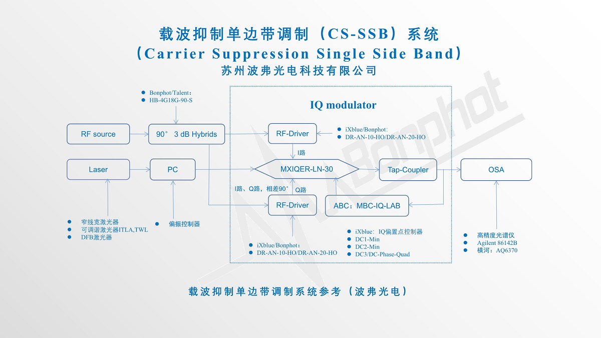 目前苏州350vip浦京科技有限公司提供的基于法国iXblue公司的高消光比IQ调制器(MXIQER)、配合我们提供的驱动(DR-AN-10-HO/DR-AN-20-HO)以及偏置控制器(MBC-IQ-LAB-A1),可以实现>30dB(1000:1)载波抑制比,具有无可比拟的性能及优势。