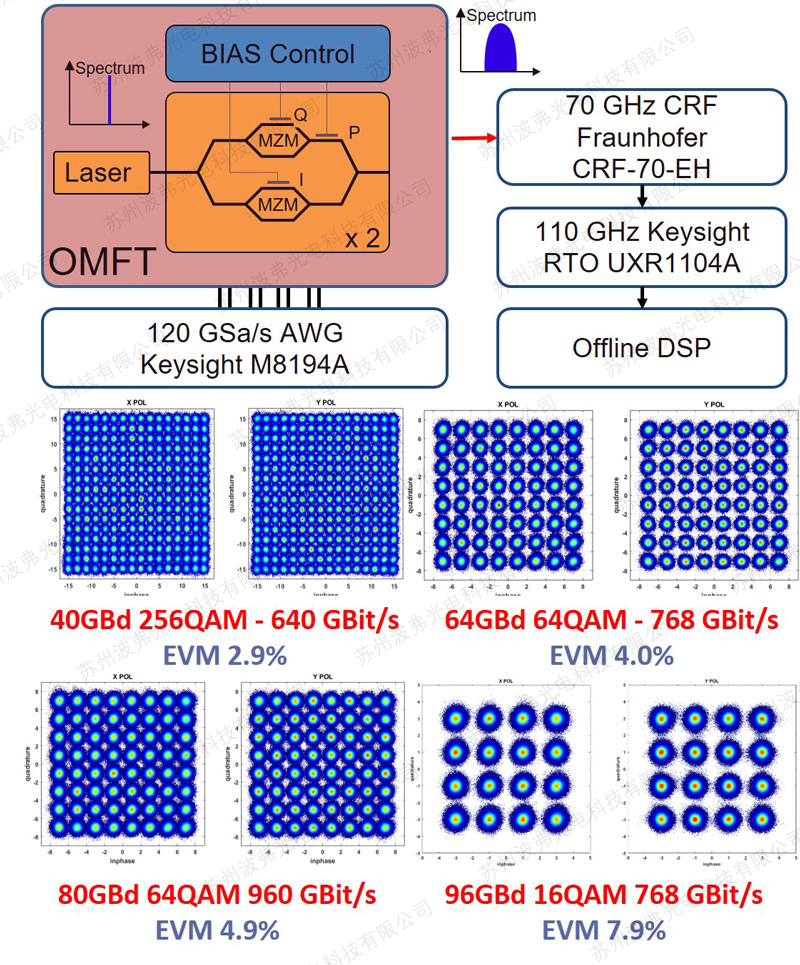 多格式光发射机 (OMFT) 是一种完全集成的光前端仪器,可将电射频信号转换为双偏振 IQ 调制光信号。