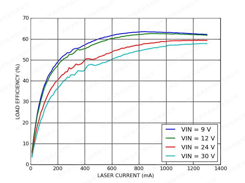 下图显示了具有200 mV激光驱动器压降的CTL300E-1-1200控制器的整体负载效率(=激光电功率/输入功率)。