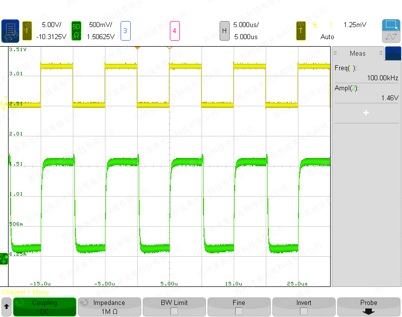 使用具有400 mV激光驱动器压降的Thorlabs BL976-SAG300泵浦激光二极管在100 mA和600 mA之间切换的示例(黄色:BSEL信号3.3 V 100 kHz,绿色:激光二极管输出功率):