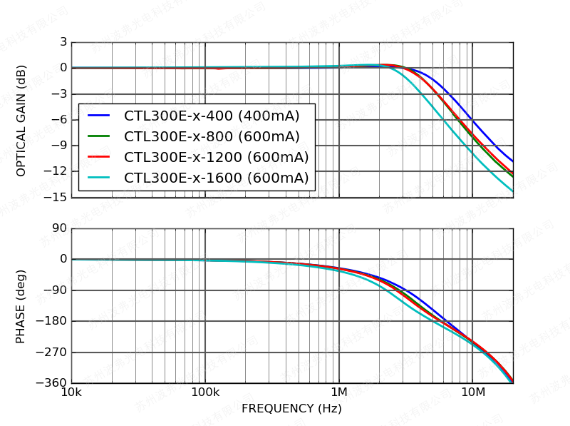 下图显示了CTL300E控制器在1 Vpp输入调制电压幅度和400 mV激光驱动器压降下测得的调制频率响应。