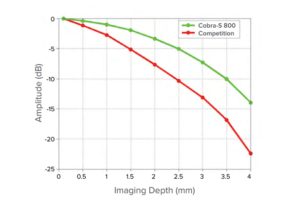 与我们的旗舰产品 Cobra-S 800 一样,Cobra OEM OCT 光谱仪提供卓越的滚降性能,从信号与成像深度的比较中可以看出。 由于滚降更少,可以比典型的 800 nm 成像更清晰地成像更深的结构。