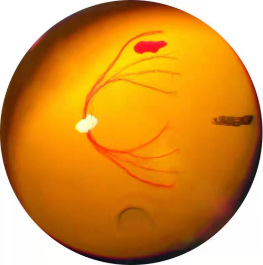 视网膜被涂成橙红色,红色的线粘在上面代表血管。做了视网膜脱离。